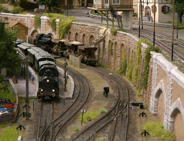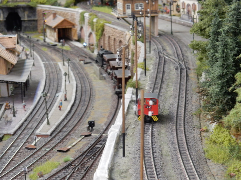 Dwars door het dorp loopt het smalspoortrajekt met voor de toren (naar voorbeeld uit Freiburg) een overweg, waar de auto’s ook stoppen voor de trein.